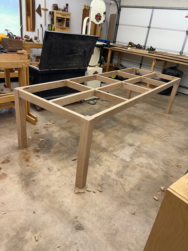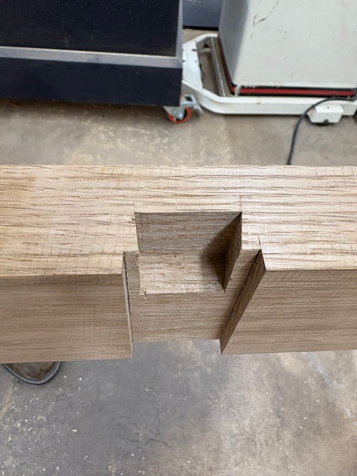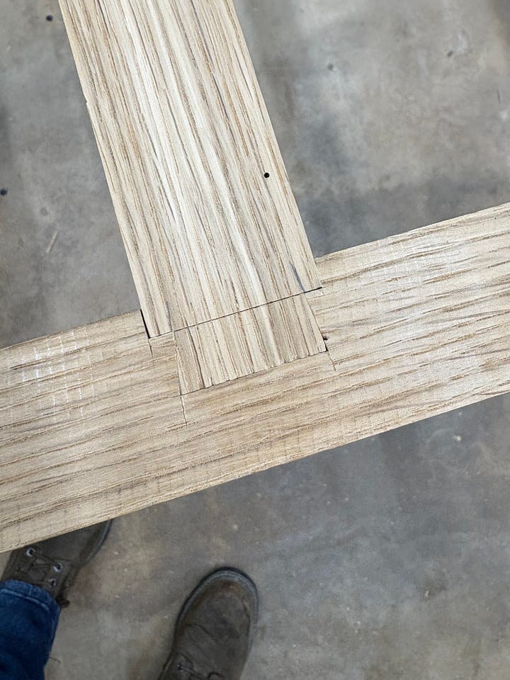 For the long stretcher, I gave myself some grace and omitted the dovetail. The short aprons won’t really see the same forces as the long aprons, and the cross laps will lock it all in place. I cut slots for the table buttons I’ll use to attach the top and then did a LOT of sanding. I’m less experienced with oak compared to walnut and cherry, so I didn’t want to try and finish plane the parts only to spend even more time addressing tear out. The table top will also be sanded, so I bit the bullet and decided to treat everything the same. If this table was for me, I’d plane it and just live with any discrepancies (light hand sanding with a 180 or 220 can help to blend the surfaces together).