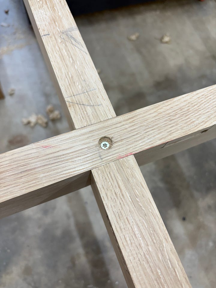 Oddly enough, gluing and screwing in the long support gave me way more hell. We’ve had a lot of rain lately, so my only guess is that things had slightly swelled and lining up all 3 cross laps proved to be a challenge. Between clamps and an assembly mallet, it eventually came together. I didn’t bother applying glue on the cross laps, just a countersunk 2-1/2” screw.